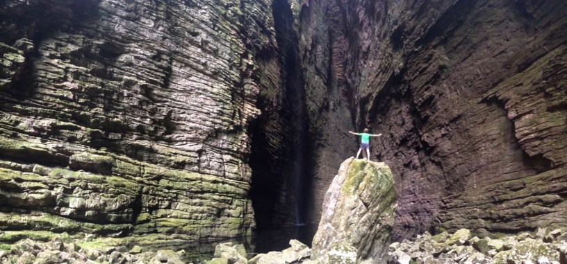 Dorielson nos levou ao longo de uma trilha com muitas árvores, até a trilha desaparecer e nós seguimos o leito do rio. As condições da trilha variam bastante entre lajedos super planos onde você pode andar rápido (quando está seco!), pedras do tamanho de carros que temos que escalar e pedras pequenas e bambas que é preciso tomar um super cuidado para não virar o pé. Um passo falso e você pode torcer o tornozelo, como não queremos que isso aconteça, então sem pressa nesta hora! Às vezes é preciso se agachar e até se arrastar agarrado a algumas pedras em caminhos estreitos beirando o rio. Felizmente, as pedras tem vários lugares para se segurar, deixando o caminho mais fácil do que parece ser.